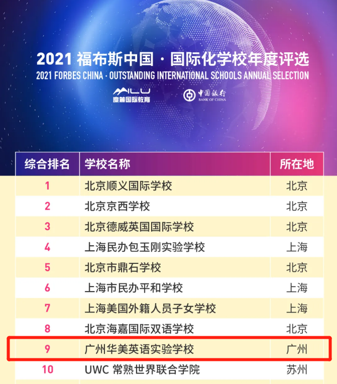 - 2021年5月18日,福布斯中国发布“国际化学校年度评选”结果,广州华美英语学校排名全国第...